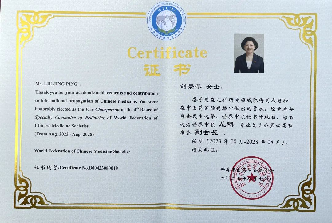 伟德国际1949药业集团党委书记、董事长刘景萍当选世界中医药学会联合会儿科专业委员会第四届理事会副会长